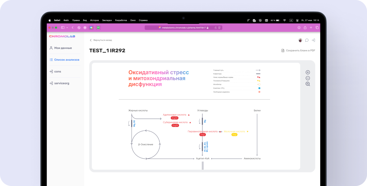 Специально для Вас мы разработали наглядную метаболомную схему, на которой отобразили отклонение показателей пациента от референтных значений.