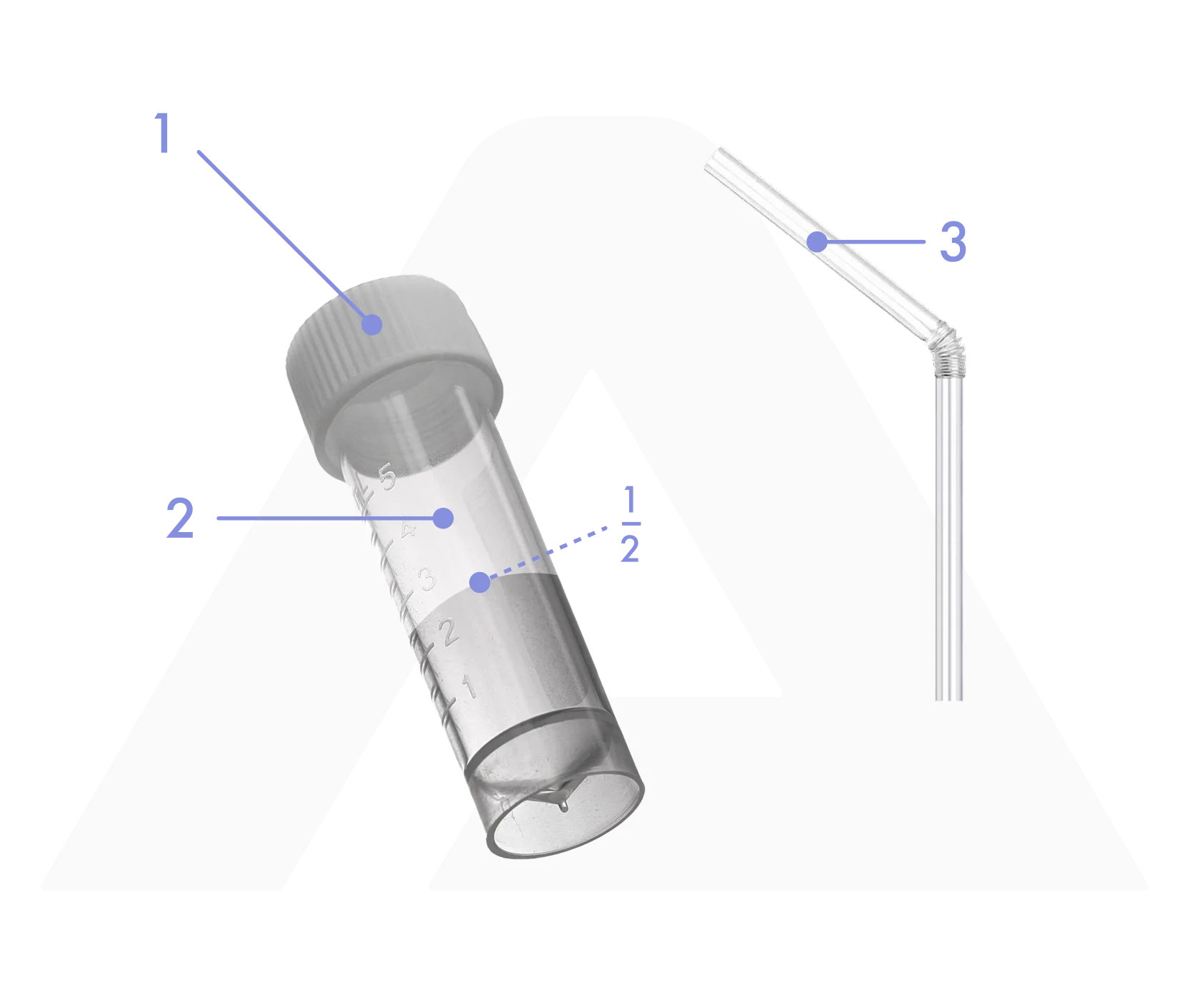 Произведите сбор слюны с помощью трубочки (3), заполнив пробирку (2) на ½ (наполовину).