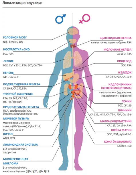 Интерпретация результатов: Онкомаркеры — биологический индикатор возникновения, роста и локализации очага опухоли. На величину онкомаркера в крови влияет ряд факторов: продукция маркера тканью опухоли, высвобождение его из ткани; масса опухоли и ее кровоснабжение; режим пациента (фаза менструального цикла); катаболизм маркера, связанный с нарушениями функции печени, почек, холестазом; вредные привычки — курение, употребление алкоголя. При диагностике раковых заболеваний выбор делается в пользу одного, высокоспецифичного маркера данной опухоли. Он считается «главным», остальные могут иметь среднее значение или являются второстепенными. Для полной картины целесообразно исследовать уровни всех маркеров, характерных для данного вида опухоли. Женщины более подвержены развитию опухолевых процессов репродуктивных органов — молочные железы, шейка матки, яичники, поэтому исследования проводится для разных групп маркеров опухолевого роста.