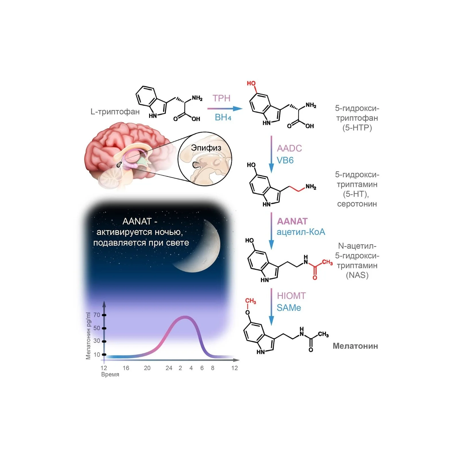 Основной синтез происходит в ночное время под влиянием циркадных сигналов, поступающих из супрахиазматического ядра гипоталамуса. Начинается с аминокислоты триптофана, которая преобразуется в 5-гидрокситриптамин (серотонин) через промежуточные стадии. Затем серотонин ацетилируется и метилируется с образованием мелатонина.